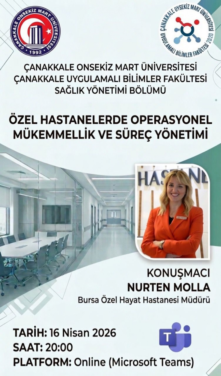 We are pleased to invite you to an online seminar featuring Ms. Nurten Molla, Manager of Bursa Private Hayat Hospital. She will be sharing her expertise on "Operational Excellence and Process Management in Private Hospitals."